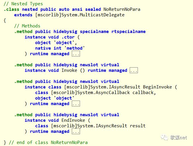通过ILSpy反编译直接查看中间语言,其实委托就是个class,有构造函数,有Invoke/BeginInvoke/EndInvoke实例方法,继承自 System.MulticastDelegate特殊类型!